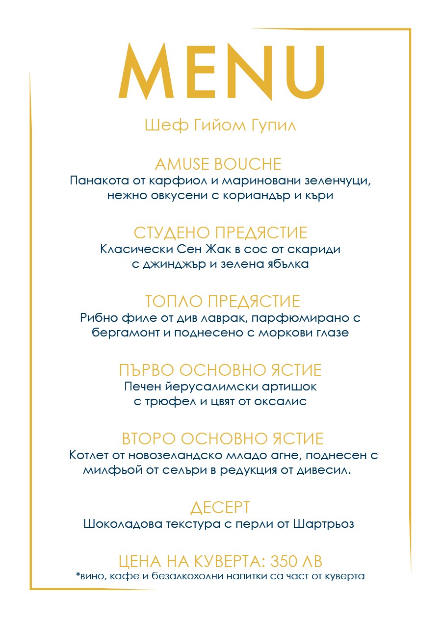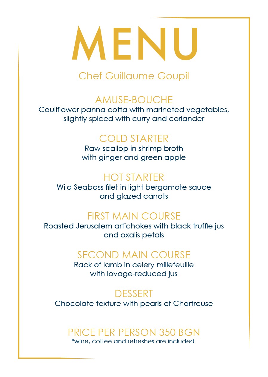 Родом от Лион, считан за кулинарната столица на Франция, той ще приготви 6-степенно меню, съчетание между силата на традицията и смелостта на експеримента, приготвено от най-висококачествени пресни продукти, подбрани лично от него и поднесено с фреснки стил и финес.